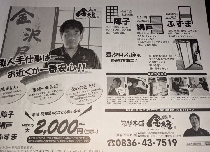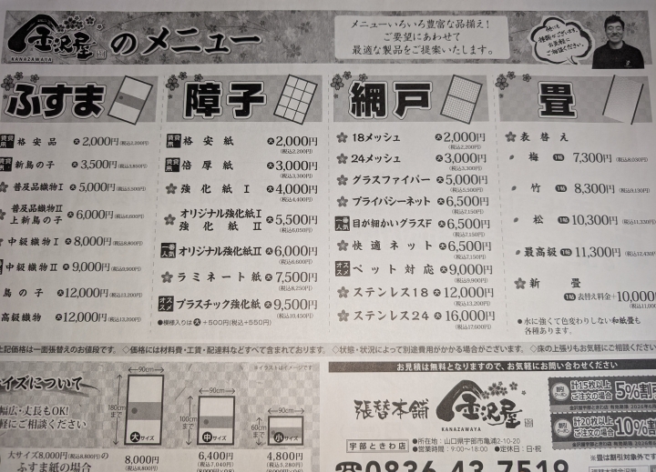 当店チラシのオモテ面です。上が宇部ときわ店〔宇部市内、山口市阿知須に折込〕のもので武濤(兄)がメイン、下が山口店〔山口市中央部~南部に折込〕のもので武濤(弟)がメインで登場しております。