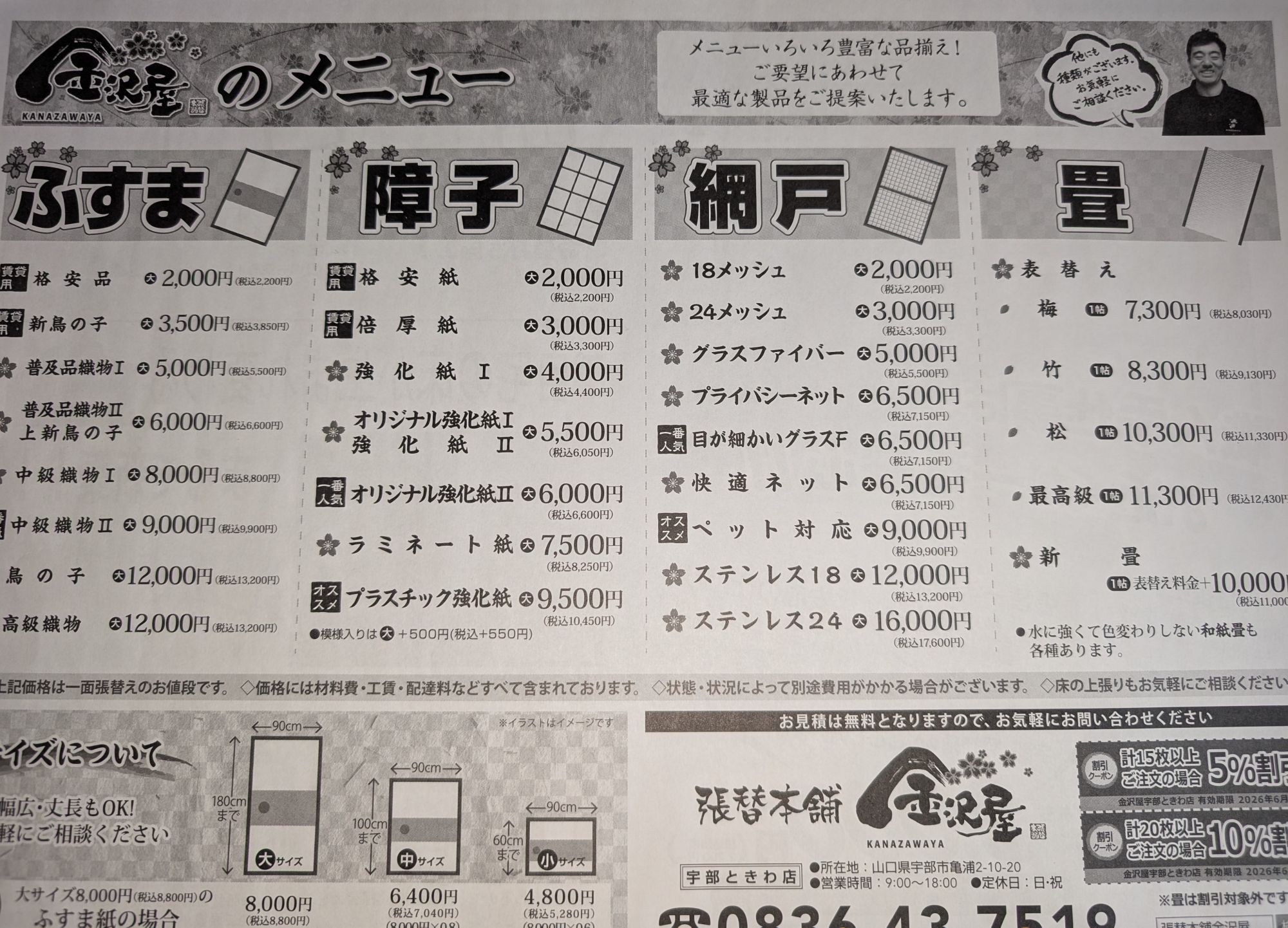 当店チラシのウラ面に掲載しているメニュー表(価格表)が右の写真です。このように幅広いラインナップを揃えてお待ちしております。